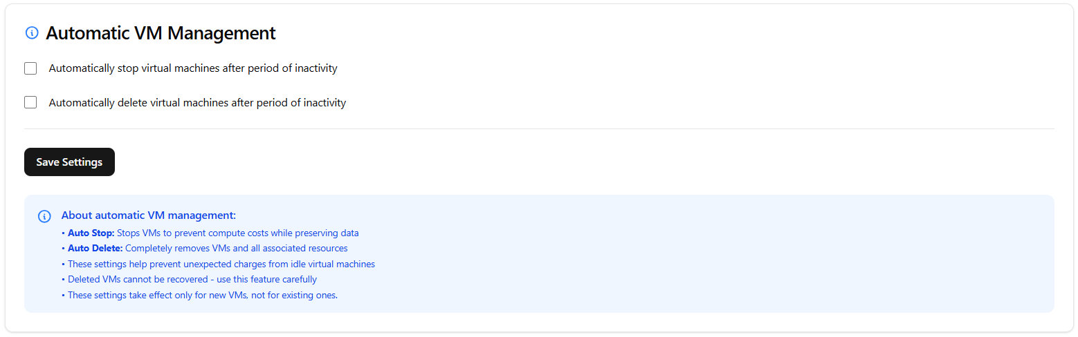 Automatic VM management is designed to help you reduce costs by automatically stopping or deleting unused VMs.